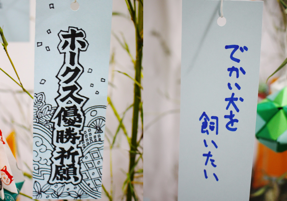 今年の笹の葉飾りやみなさんの願い事をいくつか紹介いたします。