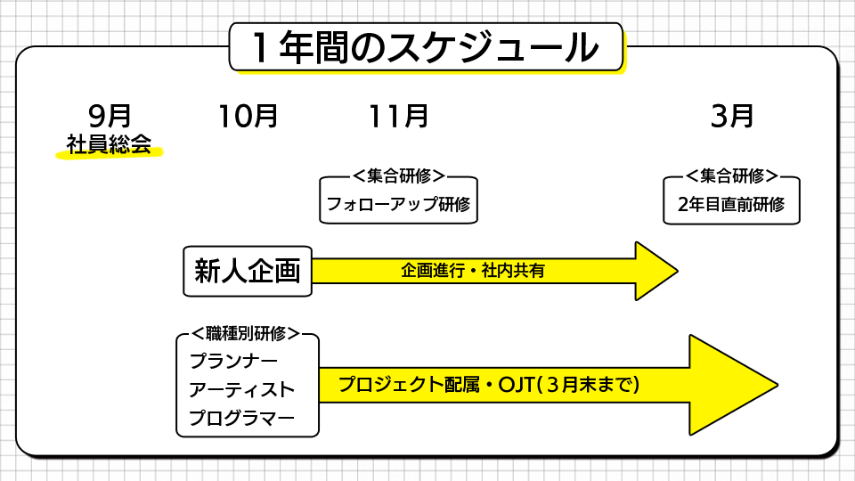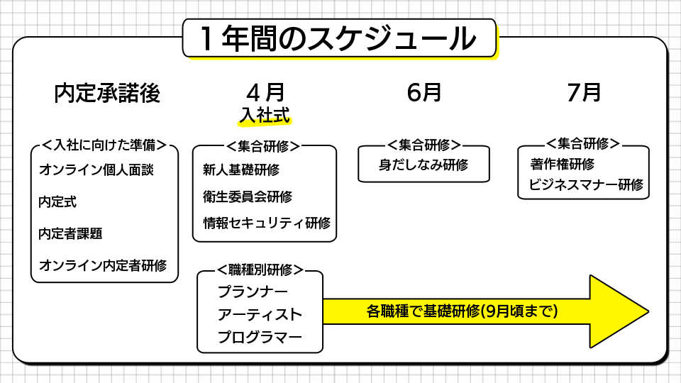 (※)新卒一年目の一年間の研修スケジュールについては過去のBLOG記事にて詳しくご紹介しています。